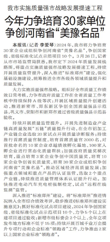 2024年,我市将力争培育30家企业或组织争创河南省“美豫名品”,争创国家级、省级标准化试点示范项目10个。3月26日,记者从市市场监管局获悉,我市定下2024年质量发展线路图,将重点实施质量强市战略发展提速工程,持续开展质量监管提升,深入推进“标准郑州”建设,强化基础设施建设,统筹推进全市各级各领域质量提升和质量发展。(今日《郑州日报》6版)