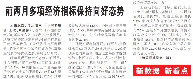 记者26日从国新办举行的新闻发布会上获悉:今年前两月,消费市场持续恢复向好,外贸运行总体平稳、结构优化,工业经济保持平稳增长,多项经济指标保持向好态势,高质量发展取得积极进展,实现良好开局。(今日《人民日报》1版、3版)