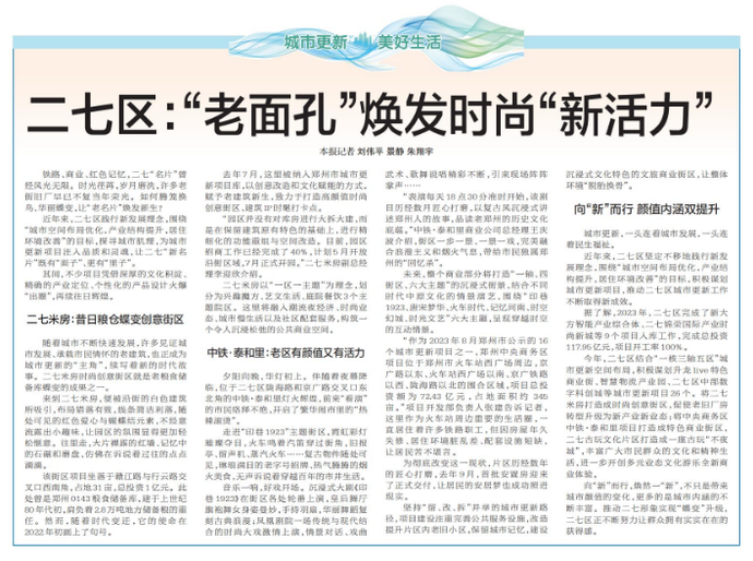 铁路、商业、红色记忆,二七“名片”曾经风光无限。时光荏苒,岁月磨洗,许多老街旧厂早已不复当年荣光。如何腾笼换鸟、华丽蝶变,让“老名片”焕发新生?(今日《郑州日报》7版)