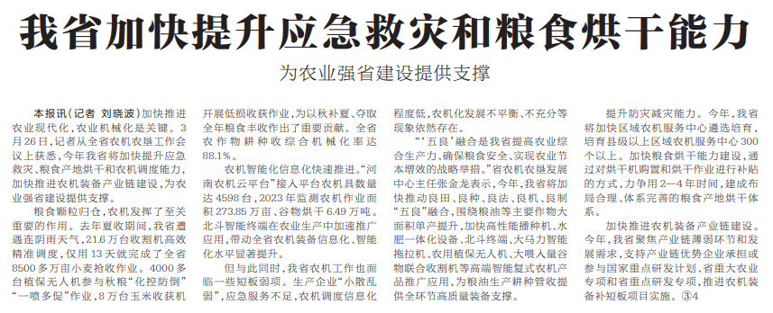 加快推进农业现代化,农业机械化是关键。3月26日,记者从全省农机农垦工作会议上获悉,今年我省将加快提升应急救灾、粮食产地烘干和农机调度能力,加快推进农机装备产业链建设,为农业强省建设提供支撑。(今日《河南日报》1版)