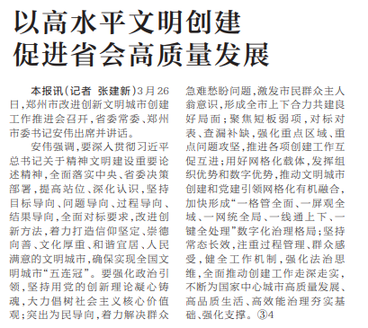 3月26日,郑州市改进创新文明城市创建工作推进会召开,省委常委、郑州市委书记安伟出席并讲话。(今日《河南日报》2版)