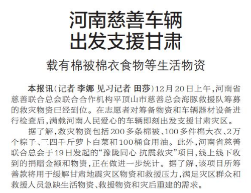 12月20日上午,河南省慈善联合总会联合合作机构平顶山市慈善总会海豚救援队筹募的救灾物资已经到位。在志愿者对筹备物资和车辆器材设备进行检查后,满载河南人民爱心的车辆即刻出发支援甘肃灾区。(今日《郑州日报》1版)