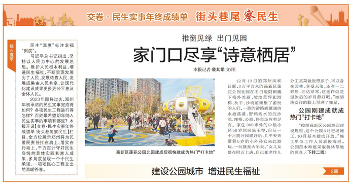 12月19日的郑州风和日丽,3万平方米的高新区莲花公园北园在冬日暖阳照耀下格外美丽,坡地草坪和滑梯、秋千、沙坑前集聚了游玩的人们,一旁的游路蜿蜒通向水波荡漾、野鸭戏水的沉沙池,座椅、公厕、停车场应有尽有。家住300米外的中粮小区58岁居民陈玉琴,自从一个月前公园建好后,几乎天天带着5岁的小外孙女来此游玩,一玩就是大半天。“女儿女婿在附近上班,自己和老伴儿分工买菜做饭带孩子,可以身在园林、享受天伦,还有一二邻居,话话家常,这也许就是退休后的岁月静好吧。”她恬淡安详的脸上写满了知足。(今日《郑州日报》1版、2版)