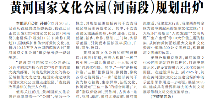 12月20日,记者从省发展改革委获悉,我省近日正式印发《黄河国家文化公园(河南段)建设保护规划》,围绕保护和传承好黄河文化,在省内10.13万平方公里的范围内对“黄河国家文化公园”建设作出统一规划部署。(今日《河南日报》1版、4版)