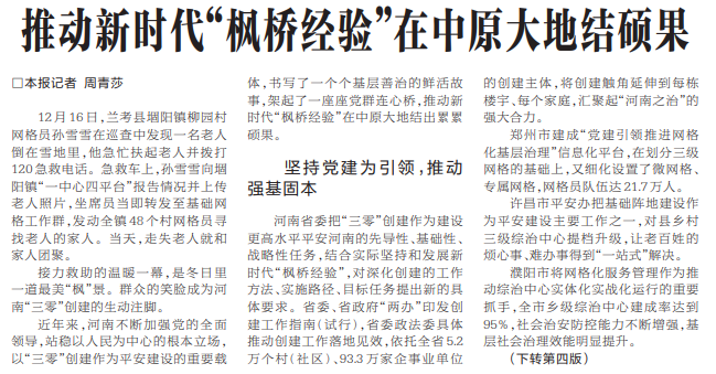 近年来,河南不断加强党的全面领导,站稳以人民为中心的根本立场,以“三零”创建作为平安建设的重要载体,书写了一个个基层善治的鲜活故事,架起了一座座党群连心桥,推动新时代“枫桥经验”在中原大地结出累累硕果。(今日《河南日报》1版、4版)