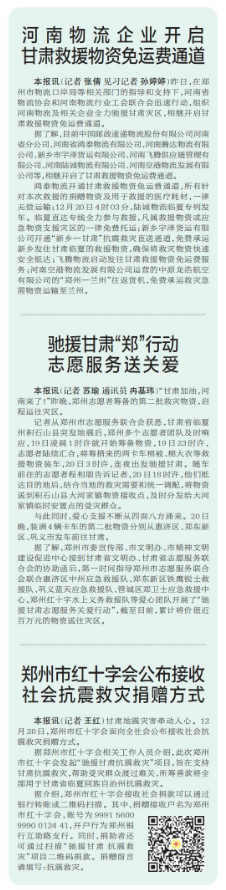 甘肃地震灾害牵动人心。12月20日,郑州市红十字会面向全社会公布接收社会抗震救灾捐赠方式。(今日《郑州日报》2版)
