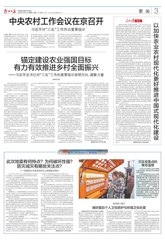 中央农村工作会议19日至20日在北京召开。会议以习近平新时代中国特色社会主义思想为指导,全面贯彻落实党的二十大和二十届二中全会精神,深入贯彻落实习近平总书记关于“三农”工作的重要论述,贯彻落实中央经济工作会议精神,分析当前“三农”工作面临的形势和挑战,部署2024年“三农”工作。(今日《人民日报》1版、2版)