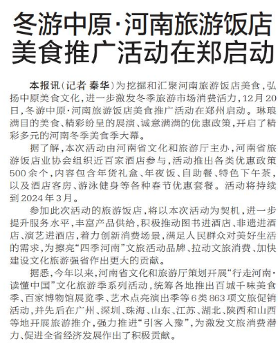 为挖掘和汇聚河南旅游饭店美食,弘扬中原美食文化,进一步激发冬季旅游市场消费活力,12月20日,冬游中原·河南旅游饭店美食推广活动在郑州启动。琳琅满目的美食、精彩纷呈的展演、诚意满满的优惠政策,开启了精彩多元的河南冬季美食季大幕。(今日《郑州日报》6版)