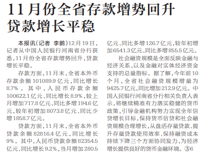 12月19日,记者从中国人民银行河南省分行获悉,11月份全省存款增势回升,贷款增长平稳。(今日《河南日报》3版)