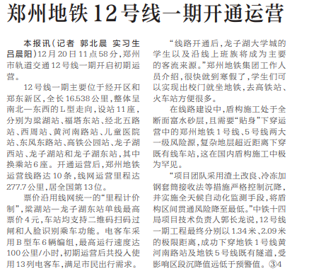 12月20日11点58分,郑州市轨道交通12号线一期开启初期运营。(今日《河南日报》3版)