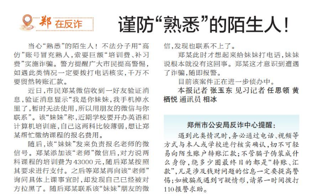当心“熟悉”的陌生人!不法分子用“高仿”账号冒充熟人,索要巨额“培训费、补习费”实施诈骗。警方提醒广大市民提高警惕,如遇此类情况一定要拨打电话核实,千万不要贸然转账汇款。(今日《郑州日报》6版)