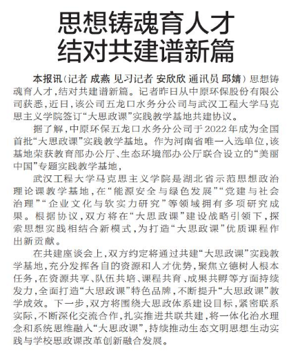 思想铸魂育人才,结对共建谱新篇。记者昨日从中原环保股份有限公司获悉,近日,该公司五龙口水务分公司与武汉工程大学马克思主义学院签订“大思政课”实践教学基地共建协议。(今日《郑州日报》6版)