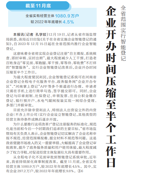 12月19日,记者从省市场监管局获悉,该局近日印发《关于在全省实施企业智能登记的通知》,自2023年12月15日起在全省范围内推行企业智能登记。(今日《河南日报》4版)