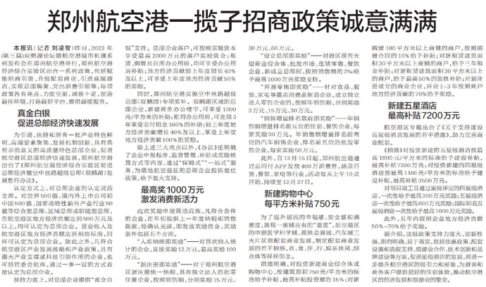 昨日,2023 年(第三届)双鹤湖论坛暨航空港城市机遇系列发布会在郑州航空港举行,郑州航空港经济综合实验区出台一系列政策,包括赋能招商引资、升级配套商业、引进高端酒店、实现总部集聚、突出消费引领等,每项政策各有亮点、力度空前、诚意十足,创造最佳环境、打造最好平台、提供最暖服务。(今日《郑州日报》7版)