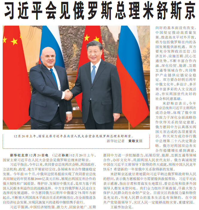 12月20日上午,国家主席习近平在人民大会堂会见俄罗斯总理米舒斯京。(今日《人民日报》1版)