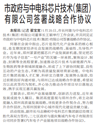 1月25日,市长何雄与中电科芯片技术(集团)有限公司董事长王颖举行工作会谈,并共同见证市政府与中电科芯片技术(集团)有限公司签署战略合作协议。(今日《郑州日报》1版)