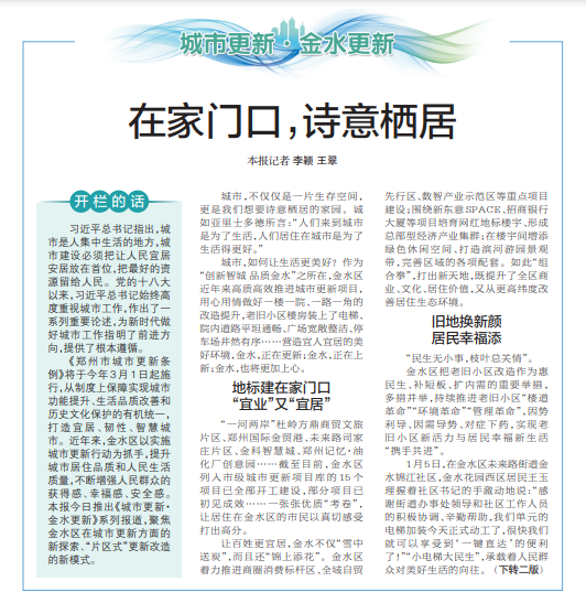 城市,如何让生活更美好?作为“创新智城 品质金水”之所在,金水区近年来高质高效推进城市更新项目,用心用情做好一楼一院、一路一角的改造提升,老旧小区楼房装上了电梯、院内道路平坦通畅、广场宽敞整洁、停车场井然有序……营造宜人宜居的美好环境,金水,正在更新;金水,正在上新;金水,也将更加上心。(今日《郑州日报》1版、2版)
