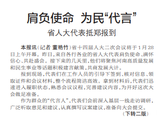 省十四届人大二次会议将于1月28日上午开幕。昨日,来自各行各业的省人大代表肩负使命、满怀信心、共赴盛会。接下来的几天里,他们将聚焦河南高质量发展和民生事业等话题积极建言献策,共商发展大计。(今日《郑州日报》1版、2版)
