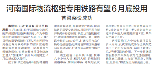 1月26日,位于郑州航空港区的郑州国际陆港传来消息,作为中欧班列扩量提质并实现“万列、千万吨”目标的重要保障性工程,河南国际物流枢纽专用铁路项目的首片梁板在梅河大桥处成功架设。随着首跨T梁精准落位,也标志着该项目全线施工进入“加速期”,预计5月底完工,6月底正式投入使用。(今日《郑州日报》1版)