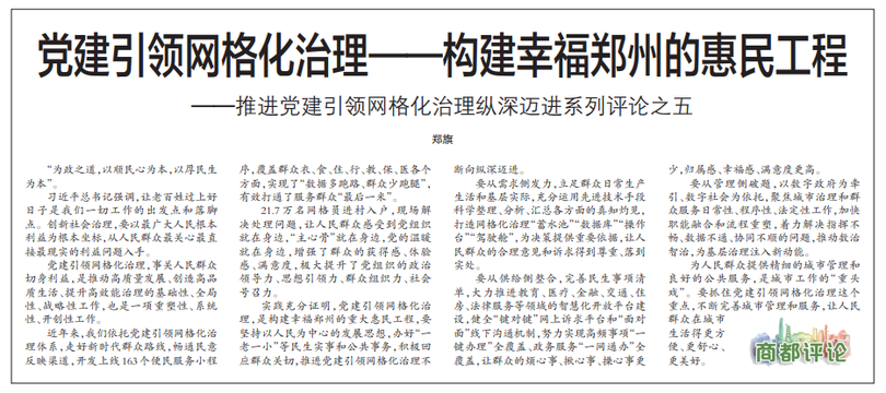 党建引领网格化治理,事关人民群众切身利益,是推动高质量发展、创造高品质生活、提升高效能治理的基础性、全局性、战略性工作,也是一项重塑性、系统性、开创性工作。(今日《郑州日报》2版)