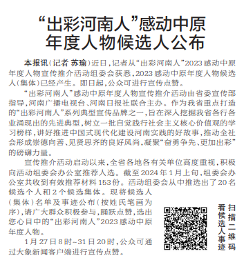 近日,记者从“出彩河南人”2023感动中原年度人物宣传推介活动组委会获悉,2023感动中原年度人物候选人(集体)已经产生。即日起,公众可进行宣传点赞。(今日《郑州日报》2版)