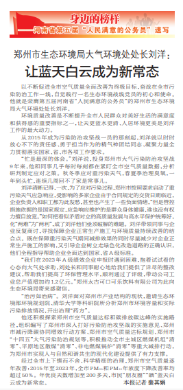 以不断促进全市空气质量全面改善为终极目标,奋战在全市污染防治工作一线,自觉践行一名生态环境战线党员的初心和使命。他就是荣膺第五届河南省“人民满意的公务员”的郑州市生态环境局大气环境处处长刘洋。(今日《郑州日报》2版)