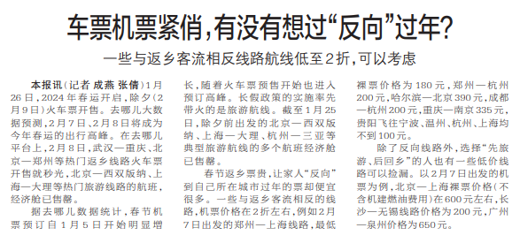 1月26日,2024年春运开启,除夕(2月9日)火车票开售。去哪儿大数据预测,2月7日、2月8日将成为今年春运的出行高峰。在去哪儿平台上,2月8日,武汉—重庆、北京—郑州等热门返乡线路火车票开售就秒光,北京—西双版纳、上海—大理等热门旅游线路的航班,经济舱已售罄。(今日《郑州日报》2版)