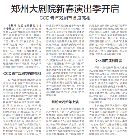 记者1月26日获悉,新春将至,郑州大剧院新春演出季暨CCD青年戏剧节正式拉开帷幕。本届演出季从2月5日横跨农历春节至5月8日,以“春之韵律,艺绽华章”为主题,分为“CCD青年戏剧节”“春之序曲”“东方腔调”“合家欢剧场”“云上有戏” 五大演绎单元,45台75场海内外精选口碑剧目,涵盖话剧、音乐剧、音乐会、戏曲、亲子剧、舞台剧等丰富品类,为百姓营造喜庆祥和的节日氛围,形式多样的演出将陪伴观众共度新春佳节。(今日《郑州日报》4版)