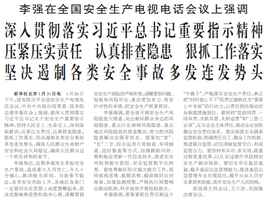 1月26日下午,国务院召开全国安全生产电视电话会议,中共中央政治局常委、国务院总理李强在会上强调,要深入贯彻落实习近平总书记关于安全生产重要指示精神,坚持人民至上、生命至上,深刻汲取教训,压紧压实责任,认真排查隐患,狠抓工作落实,坚决遏制各类安全事故多发连发势头,确保人民群众生命财产安全和社会大局稳定,确保人民群众过一个欢乐祥和的春节。(今日《人民日报》1版)