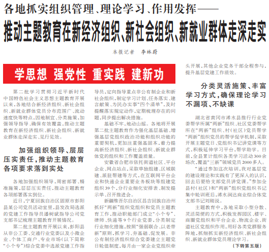 第二批学习贯彻习近平新时代中国特色社会主义思想主题教育开展以来,各地结合新经济组织、新社会组织、新就业群体党员分布范围广、流动速度快等特点,因地制宜、分类施策,加强领导指导、确保有效覆盖,推动主题教育在新经济组织、新社会组织、新就业群体走深走实、见行见效。(今日《人民日报》1版、5版)