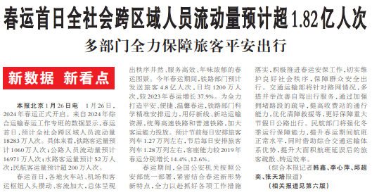 1月26日,2024年春运正式开启。来自2024年综合运输春运工作专班的数据显示,春运首日,预计全社会跨区域人员流动量18283万人次。具体来看,铁路客运量预计1060万人次;公路人员流动量预计16971万人次;水路客运量预计52万人次;民航客运量预计超200万人次。(今日《人民日报》1版、6版)