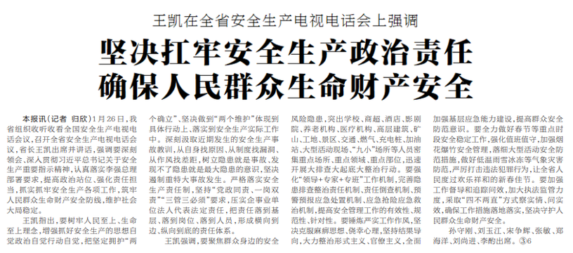 1月26日,我省组织收听收看全国安全生产电视电话会议,召开全省安全生产电视电话会议,省长王凯出席并讲话,强调要深刻领会、深入贯彻习近平总书记关于安全生产重要指示精神,认真落实李强总理部署要求,提高政治站位、强化责任担当,抓实抓牢安全生产各项工作,筑牢人民群众生命财产安全防线,维护社会大局稳定。