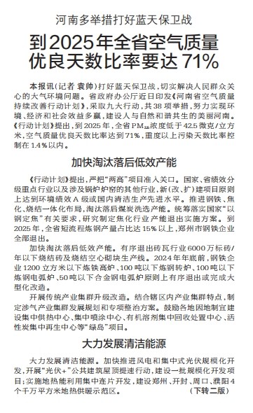 打好蓝天保卫战,切实解决人民群众关心的大气环境问题。省政府办公厅近日印发《河南省空气质量持续改善行动计划》,采取九大行动,共38项举措,努力实现环境、经济和社会效益多赢,建设人与自然和谐共生的美丽河南。《行动计划》提出,到2025年,全省PM2.5浓度低于42.5微克/立方米,空气质量优良天数比率达到71%,重度以上污染天数比率控制在1.4%以内。(今日《郑州日报》1版、2版)