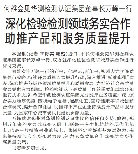 近日,市长何雄会见华测检测认证集团董事长万峰一行,双方就深化检验检测领域务实合作进行探讨交流。(今日《郑州日报》1版)
