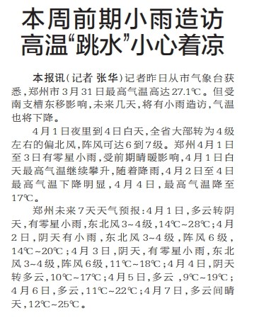 记者昨日从市气象台获悉,郑州市3月31日最高气温高达27.1℃。但受南支槽东移影响,未来几天,将有小雨造访,气温也将下降。(今日《郑州日报》1版)