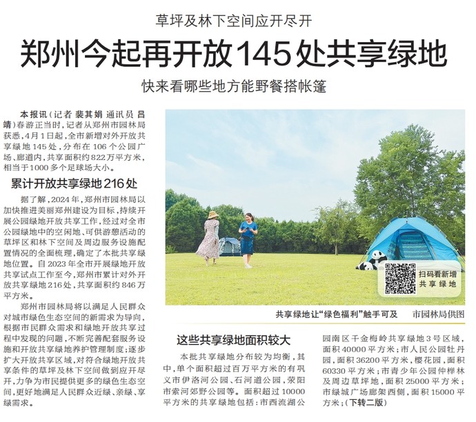 春游正当时,记者从郑州市园林局获悉,4月1日起,全市新增对外开放共享绿地145处,分布在106个公园广场、廊道内,共享面积约822万平方米,相当于1000多个足球场大小。(今日《郑州日报》1版、2版)