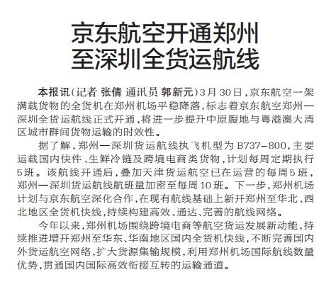 3月30日,京东航空一架满载货物的全货机在郑州机场平稳降落,标志着京东航空郑州—深圳全货运航线正式开通,将进一步提升中原腹地与粤港澳大湾区城市群间货物运输的时效性。(今日《郑州日报》1版)