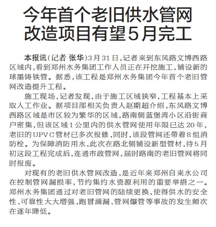 3月31日,记者来到东风路文博西路区域内,看到郑州水务集团工作人员正在开挖施工,铺设新的球墨铸铁管。据悉,该工程是郑州水务集团今年首个老旧管网改造提升工程。(今日《郑州日报》2版)