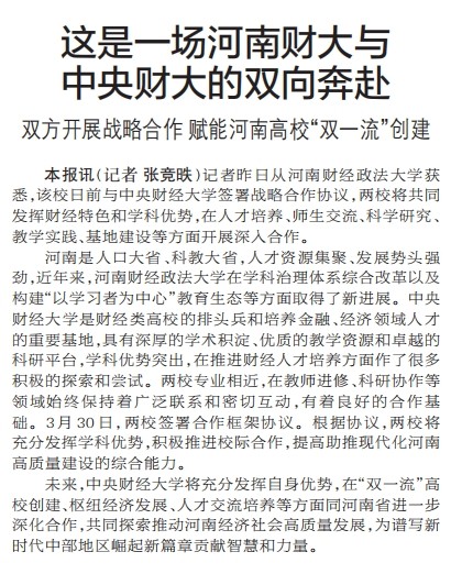 记者昨日从河南财经政法大学获悉,该校日前与中央财经大学签署战略合作协议,两校将共同发挥财经特色和学科优势,在人才培养、师生交流、科学研究、教学实践、基地建设等方面开展深入合作。(今日《郑州日报》2版)