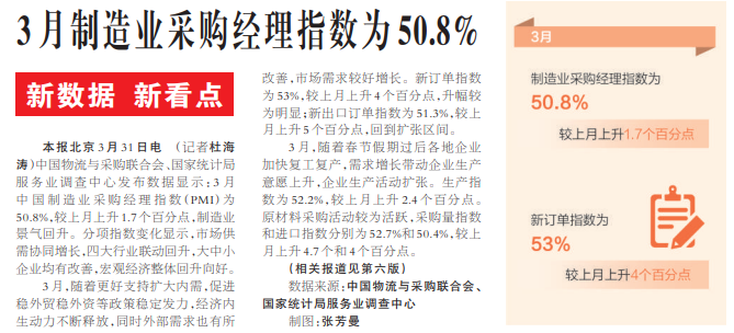3月制造业采购经理指数为50.8%