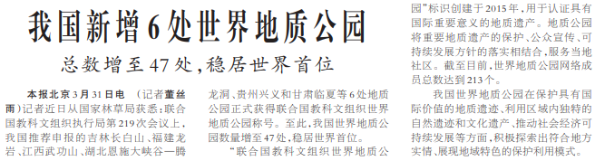 记者近日从国家林草局获悉:联合国教科文组织执行局第219次会议上,我国推荐申报的吉林长白山、福建龙岩、江西武功山、湖北恩施大峡谷—腾龙洞、贵州兴义和甘肃临夏等6处地质公园正式获得联合国教科文组织世界地质公园称号。至此,我国世界地质公园数量增至47处,稳居世界首位。(今日《人民日报》1版)