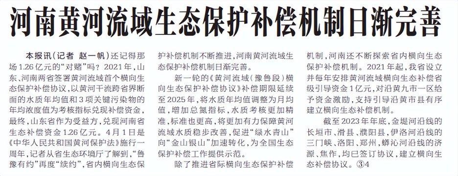 还记得那场1.26亿元的“对赌”吗?2021年,山东、河南两省签署黄河流域首个横向生态保护补偿协议,以黄河干流跨省界断面的水质年均值和3项关键污染物的年均浓度值为考核指标兑现补偿资金,最终,山东省作为受益方,兑现河南省生态补偿资金1.26亿元。4月1日是《中华人民共和国黄河保护法》施行一周年,记者从省生态环境厅了解到,“鲁豫有约”再度“续约”,省内横向生态保护补偿机制不断推进,河南黄河流域生态保护补偿机制日渐完善。(今日《河南日报》1版)