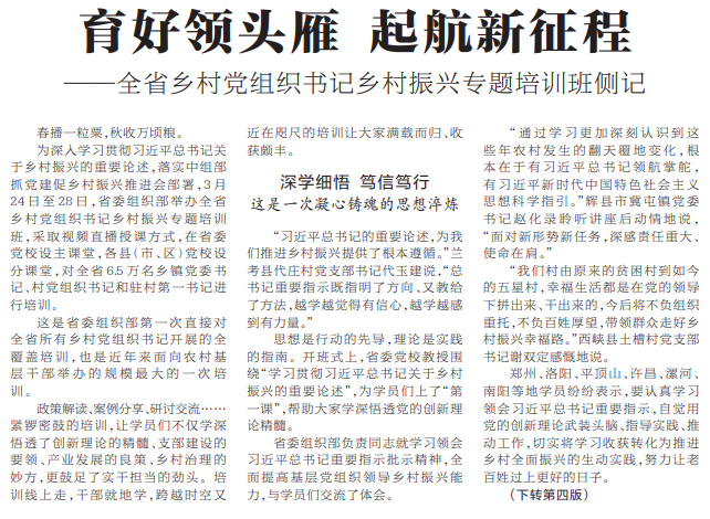 为深入学习贯彻习近平总书记关于乡村振兴的重要论述,落实中组部抓党建促乡村振兴推进会部署,3月24日至28日,省委组织部举办全省乡村党组织书记乡村振兴专题培训班,采取视频直播授课方式,在省委党校设主课堂,各县(市、区)党校设分课堂,对全省6.5万名乡镇党委书记、村党组织书记和驻村第一书记进行培训。(今日《河南日报》1版、4版)