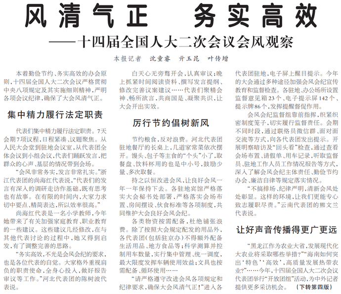 本着勤俭节约、务实高效的办会原则,十四届全国人大二次会议严格贯彻中央八项规定及其实施细则精神,严明各项会议纪律,确保了大会风清气正。(今日《人民日报》1版、4版)