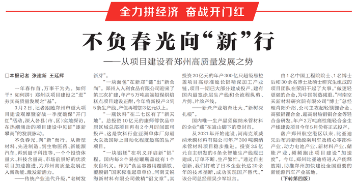 3月2日,记者跟随郑州市重大项目建设观摩暨奋战一季度确保“开门红”活动,深入各县(市、区)实地探访,在热潮涌动的项目建设中见证“逐新攀高”的发展脉动。(今日《河南日报》1版、4版)