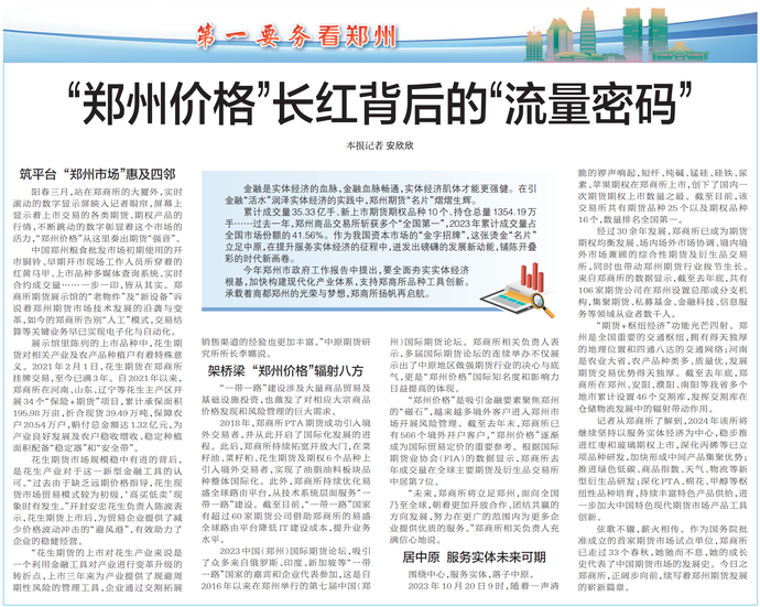 金融是实体经济的血脉,金融血脉畅通,实体经济肌体才能更强健。在引金融“活水”润泽实体经济的实践中,郑州期货“名片”熠熠生辉。