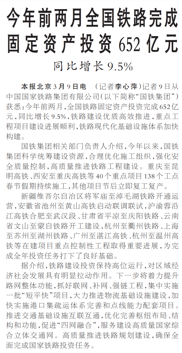 记者9日从中国国家铁路集团有限公司(以下简称“国铁集团”)获悉:今年前两月,全国铁路固定资产投资完成652亿元,同比增长9.5%,铁路建设优质高效推进,重点工程项目建设进展顺利,铁路现代化基础设施体系加快构建。(今日《人民日报》1版)