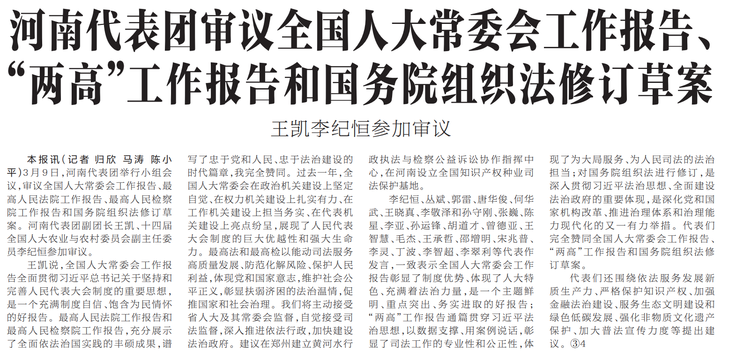 3月9日,河南代表团举行小组会议,审议全国人大常委会工作报告、最高人民法院工作报告、最高人民检察院工作报告和国务院组织法修订草案。河南代表团副团长王凯、十四届全国人大农业与农村委员会副主任委员李纪恒参加审议。(今日《河南日报》1版)