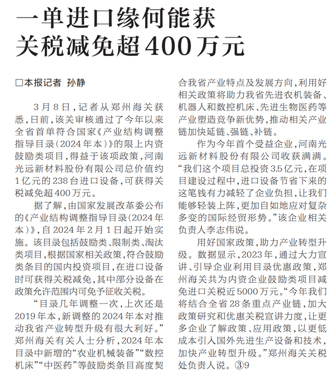3月8日,记者从郑州海关获悉,日前,该关审核通过了今年以来全省首单符合国家《产业结构调整指导目录(2024年本)》的限上内资鼓励类项目,得益于该项政策,河南光远新材料股份有限公司总价值约1亿元的238台进口设备,可获得关税减免超400万元。(今日《河南日报》1版)