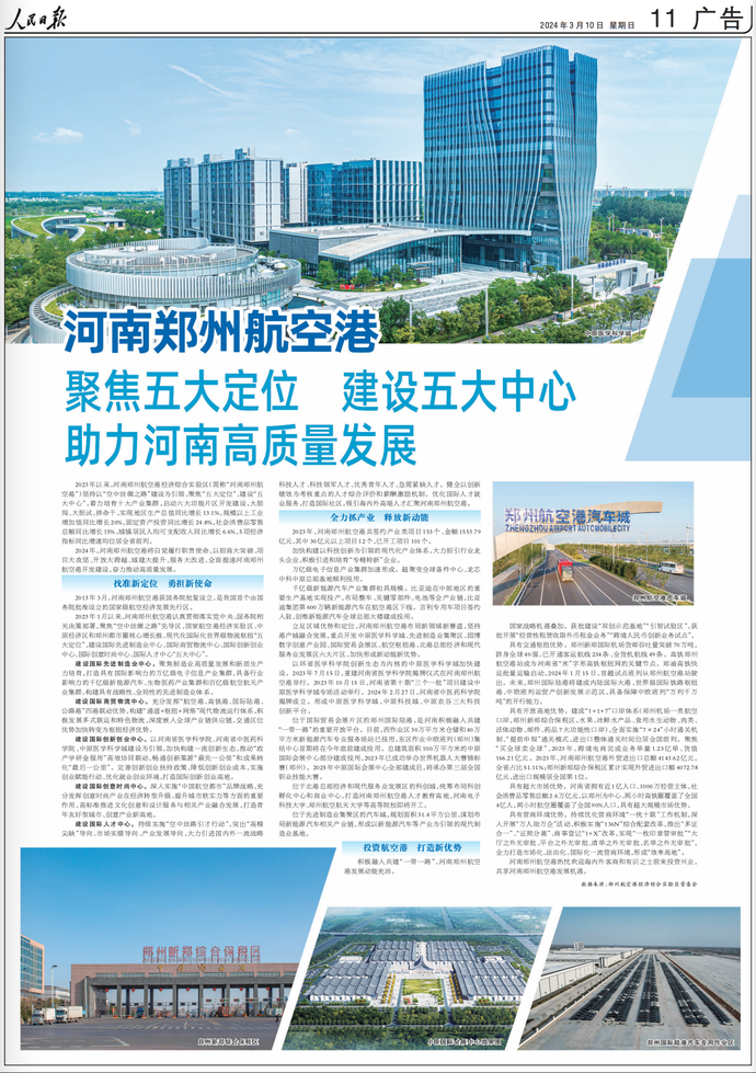 河南郑州航空港 聚焦五大定位 建设五大中心 助力河南高质量发展